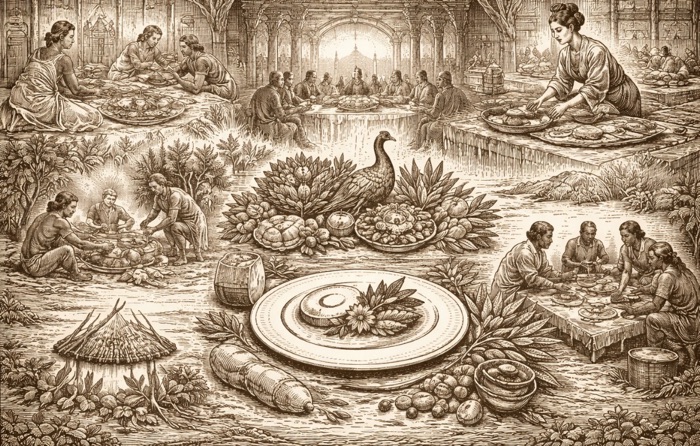 Deuxième régime : représentation – la nourriture sert dieux, rois, nations ; abondance décorative, symétrie et empilements de l’assiette visent à faire « voir » le pouvoir et l’ordre. Le goût passe au second plan, la vision devient langage politique. Égypte, Rome, Versailles, cours ottomanes.