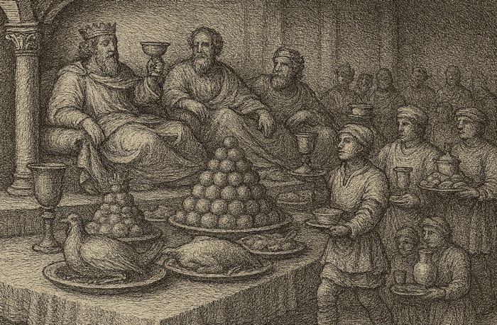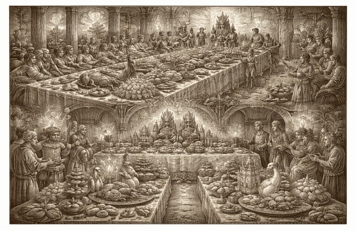 Cette rudesse n’est pas un défaut, mais un signal. Elle proclame que l’hôte n’a pas besoin de séduire par la subtilité : il lui suffit d’écraser le regard par la totalité. Le festin n’est donc pas tant une démonstration de goût qu’un refus ostentatoire de la délicatesse : j’ai le pouvoir d’exagérer, de gaspiller, de dépasser la mesure et cela suffit.