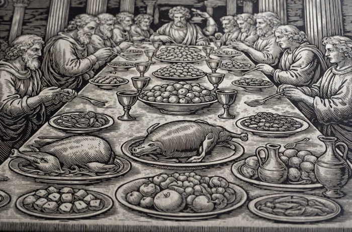 Le festin romain transforme la nourriture en une question d’échelle : quelle longueur pour la table, combien de corps peut-on y allonger, combien de services peut-on enchaîner, combien d’heures peut durer la célébration ? Le centre de gravité visuel ne réside pas dans un plat isolé, mais dans la manière dont l’ensemble de la scène exerce une pression sur les sens.