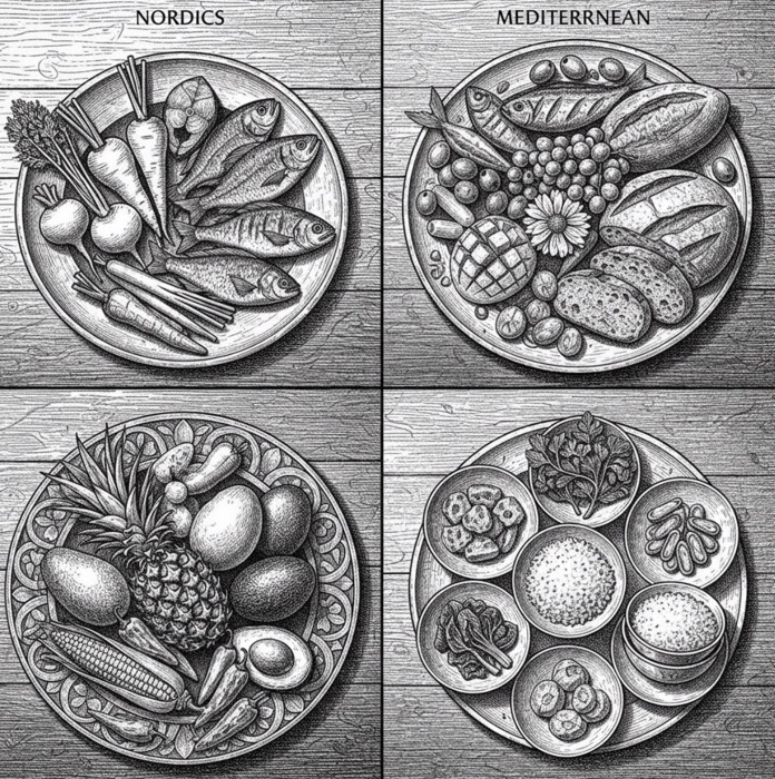 Lorsque j’observe les assiettes des régions froides et tempérées, la première chose que je ressens est une différence de densité chromatique. Dans les zones froides, les ressources alimentaires se concentrent souvent sur les racines, les céréales et les aliments conservés ; les couleurs des plats tendent vers des tons profonds et peu saturés. Dans les images de cuisines nordiques que j’ai étudiées, je retrouve sans cesse des bruns épais, des gris terreux et des blancs laiteux : ragoûts, pains et produits fermentés s’y superposent en compositions compactes et concentrées. J’ai le sentiment que ce poids visuel n’est pas seulement un choix esthétique, mais une conséquence inévitable du climat. Les longs hivers et la rareté des produits frais poussent l’assiette vers une forme fermée et resserrée, comme pour se protéger du froid extérieur. À l’inverse, dans les régions subtropicales et tropicales, mon expérience me montre que les assiettes adoptent souvent des compositions ouvertes et dispersées. L’abondance de fruits, de légumes et d’herbes offre des couleurs très saturées : rouges vifs, verts éclatants et jaunes lumineux se répondent, les aliments s’étalent plutôt qu’ils ne s’empilent. Je pense que la générosité du climat se traduit directement par une expressivité visuelle tournée vers l’extérieur ; l’assiette semble y respirer librement.
