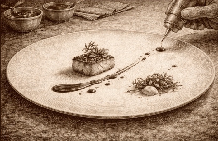 Dans la cuisine contemporaine, la sauce n’est plus un simple second rôle ; elle est devenue la voix la plus pure de l’auteur dans l’image. Chaque goutte, chaque éclaboussure, chaque vaporisation est une signature. Nous, convives, devenons alors co-auteurs de cette peinture abstraite, complétant son récit inachevé par notre regard, notre mastication, notre mémoire.